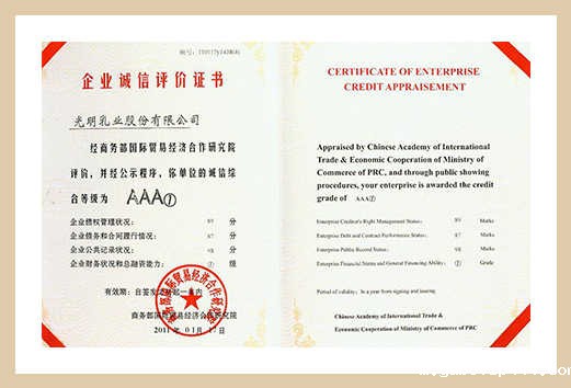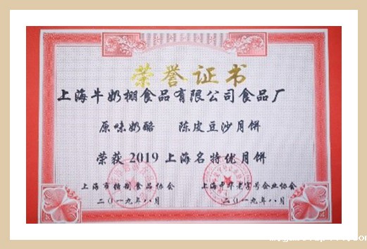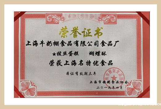 牛奶棚蝴蝶酥奖状获“上海特色旅游食品”称号